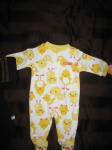 This adorable item is currently the most terrifying thing that I own. This is a newborn outfit, meaning something that size will be living inside of me in 6 short months. (O_o) But look at those little chick-a-dee footies!!!! Itll be totally worth it (right?).