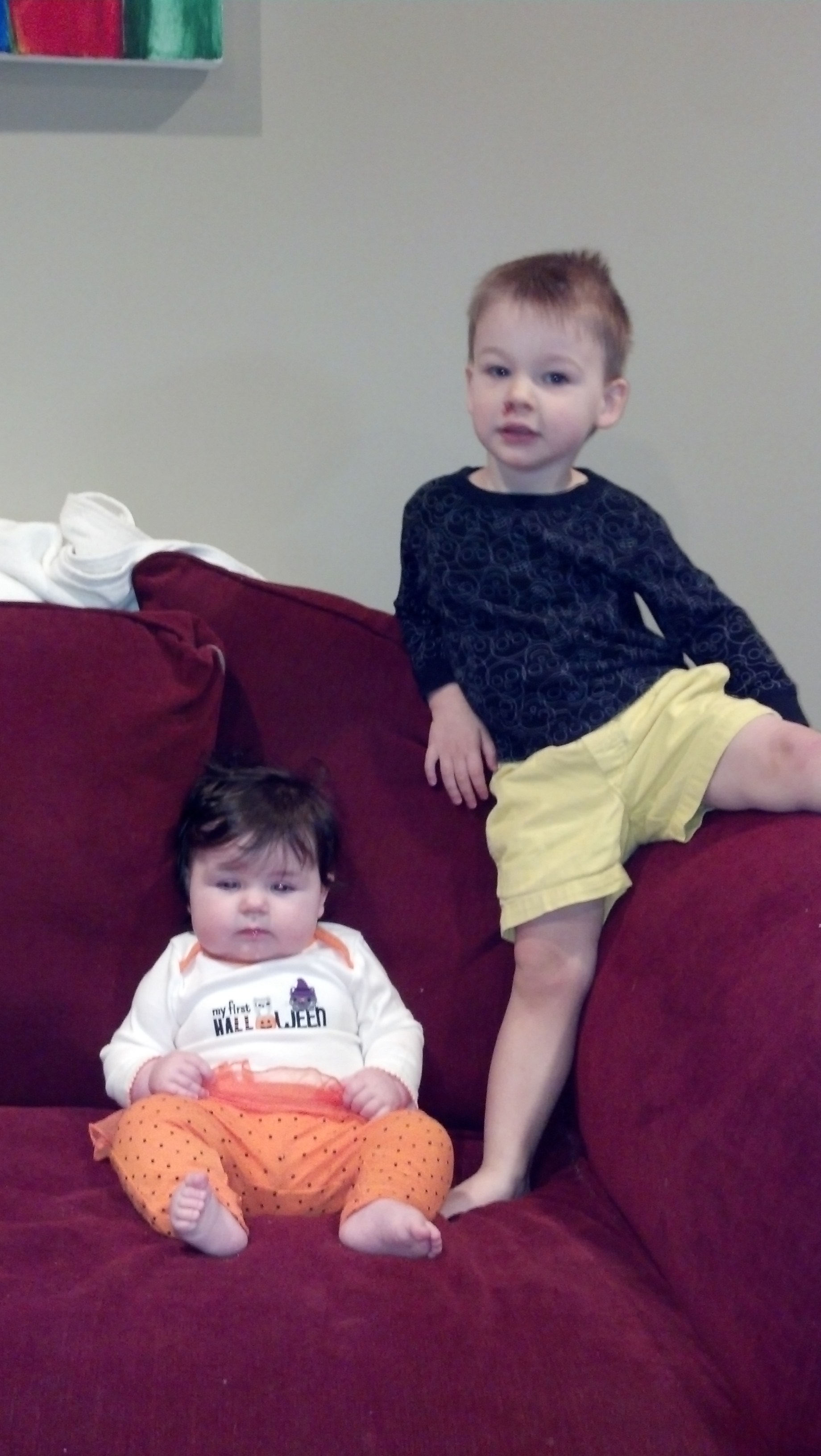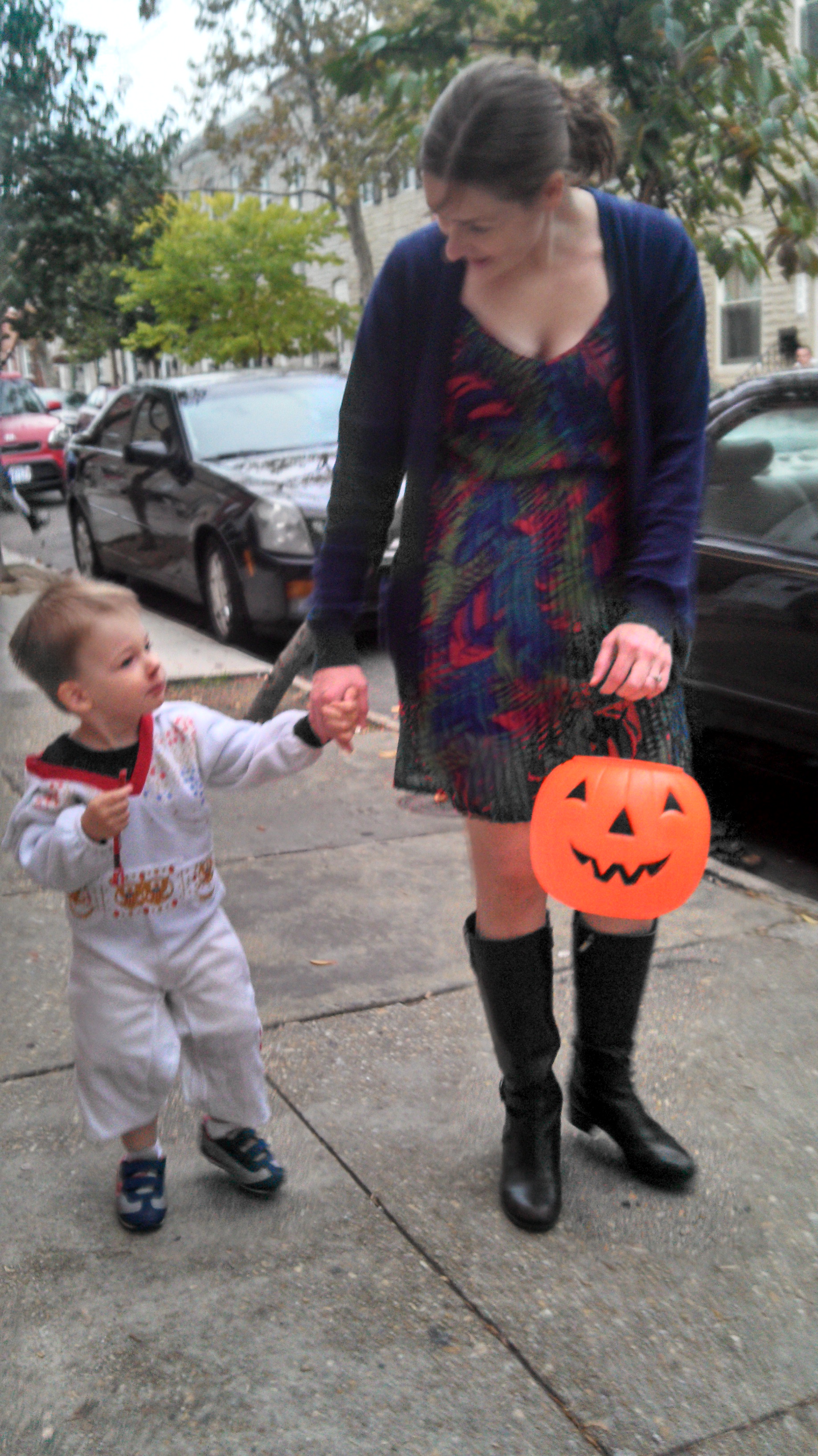 We knew Wil wouldnt be super into costumes. But we did know that Evie would make an awesome Elvis. As I was shopping around for Evie Elvis costumes, I saw toddler costumes that I thought Wil might tolerate over his other clothing. Thus, they both went as elvis. Evie had the hair for it – but we didnt bother with Wil. But we did buy Wil a new toy microphone that he carried around. I ordered the costumes a month early and practiced wearing it with Wil a few times before Halloween. We bought the pumpkin pale a few weeks before, too – and practiced ‘trick-or-treating’ in the kitchen. Wil would wear his costume and say ‘trick-or-treat’ and I would put an m&m in his bucket. Again…it was somewhat successful.