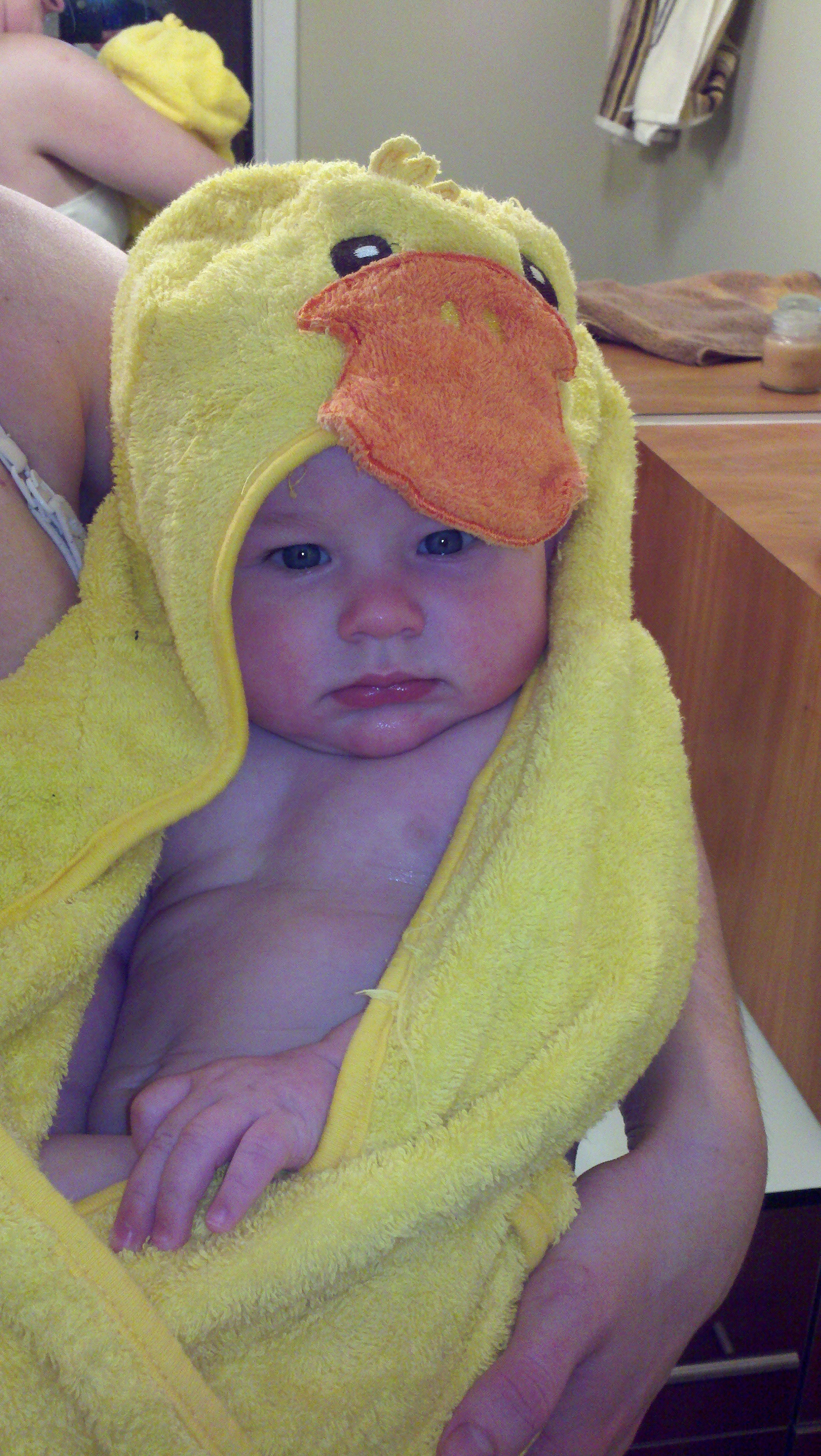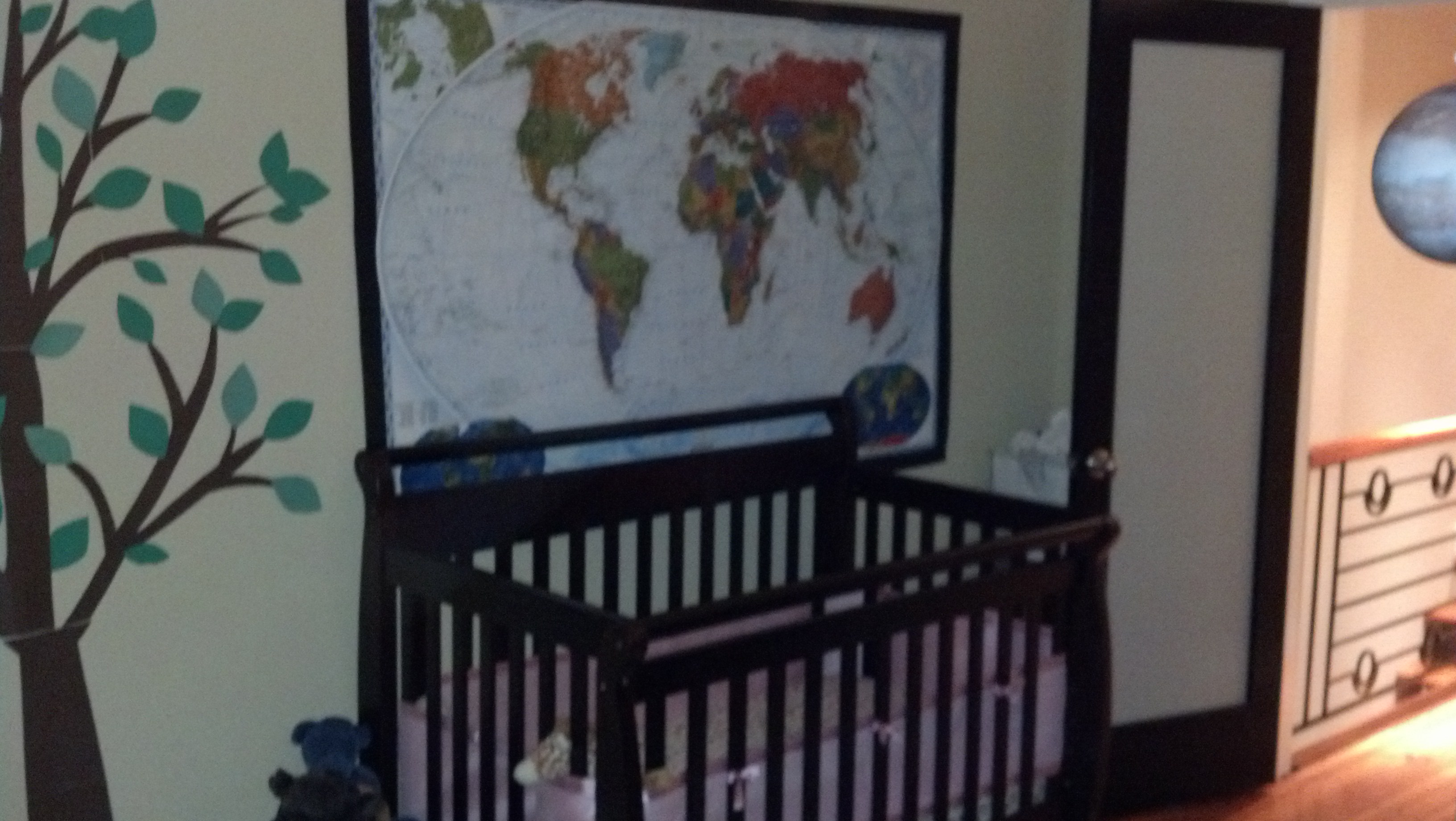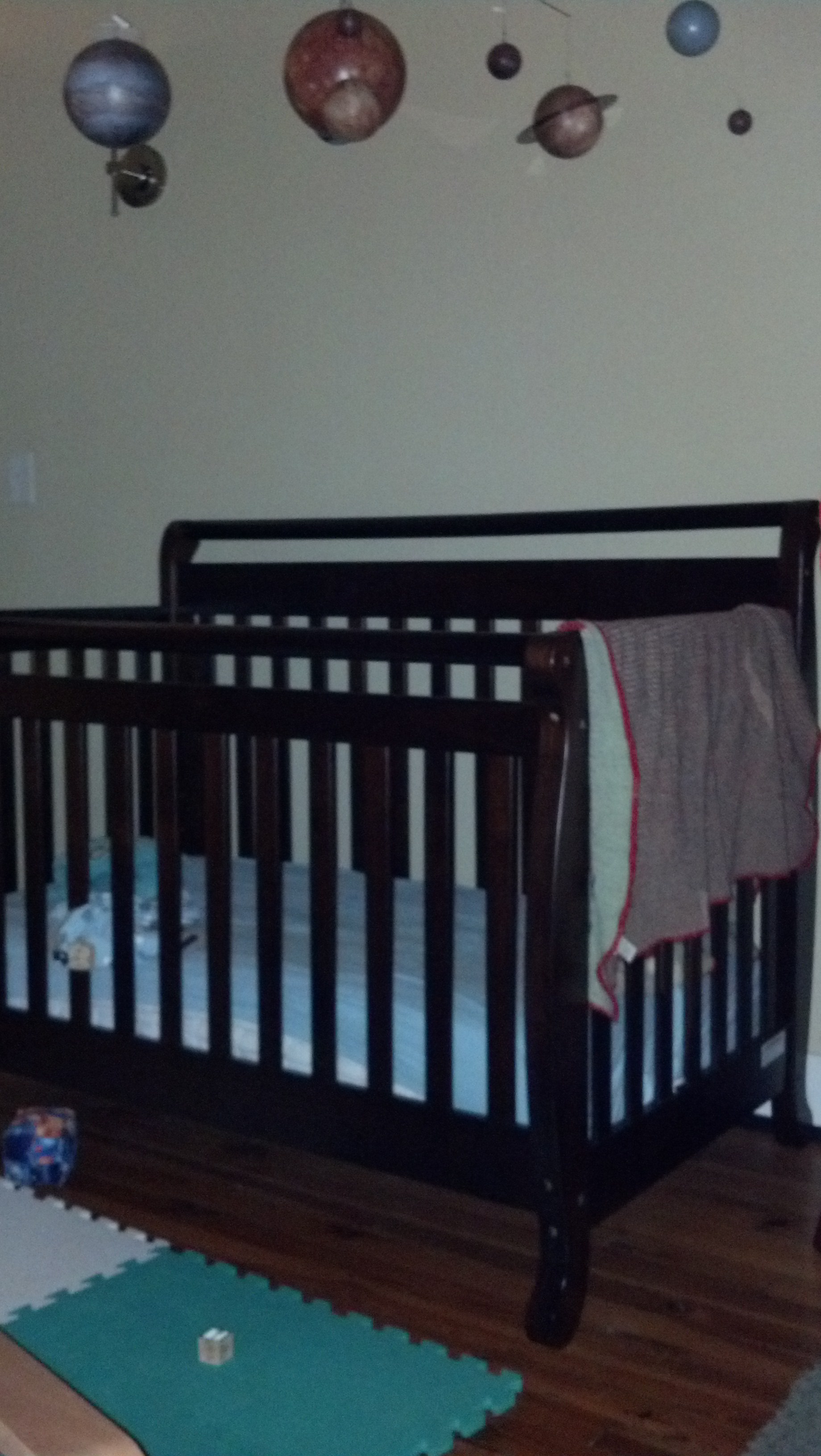 Wil takes a bath first – then Phil gets him dressed and reads stories while I give Evie a bath. Then I give Evie a bottle in the rocker and put Evie down in the crib, which we moved to the other side of the room and ‘girl-i-fied’ a bit:
