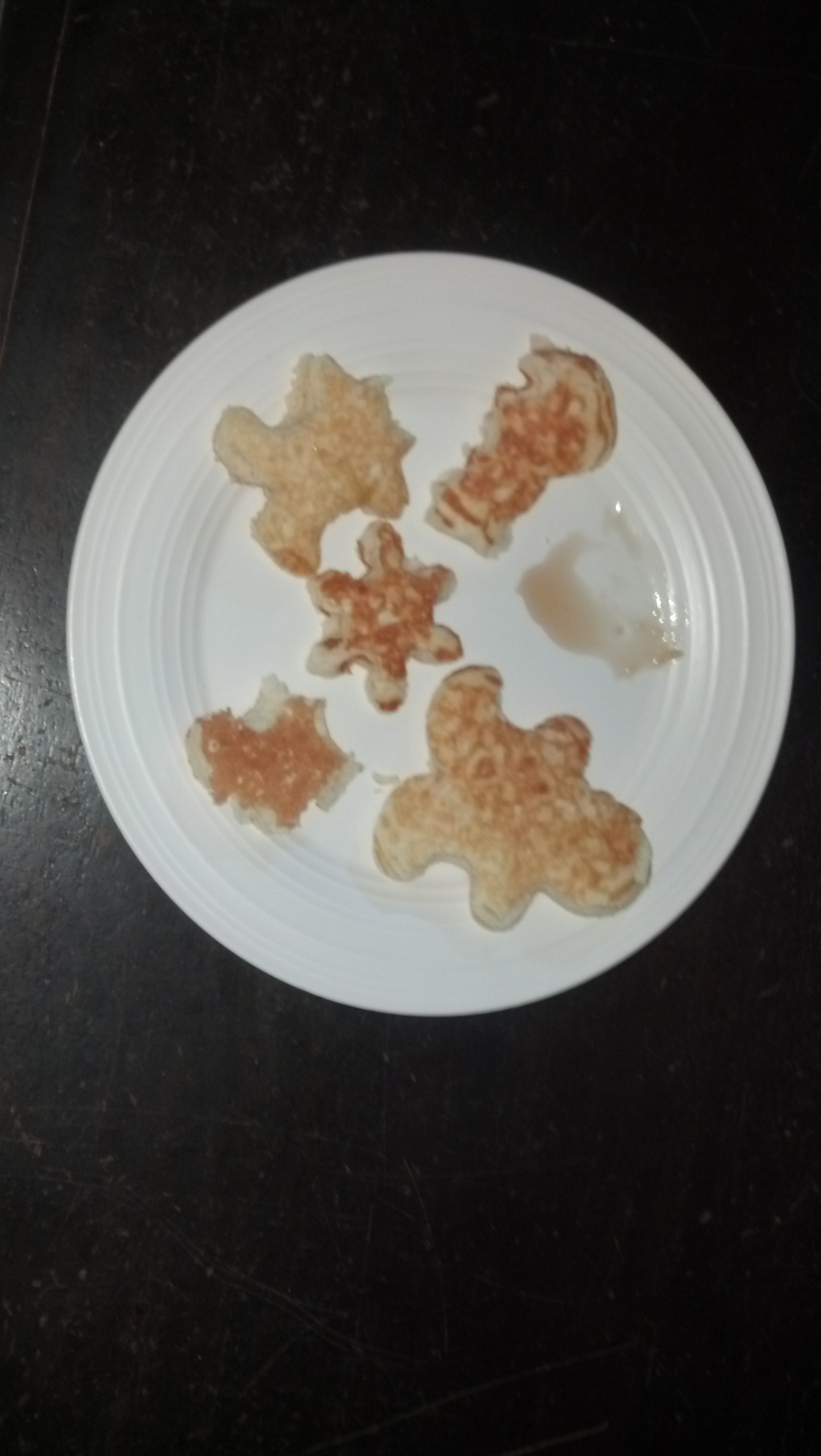 Wil has been very active in the kitchen. He loves to help me cut up vegetables for dinner or stir things on the stove. Lately, our favorite thing to do on Sunday morning is make pancakes together. He loves to pour in pre-measured ingredients. Sometimes his aim is a little off and flour goes evvvvverywhere! but thats part of the fun, right? Then the most fun involves cutting shapes out of the pancakes with cookie cutters! Heres and example of his and her breakfasts on a sunday morning: