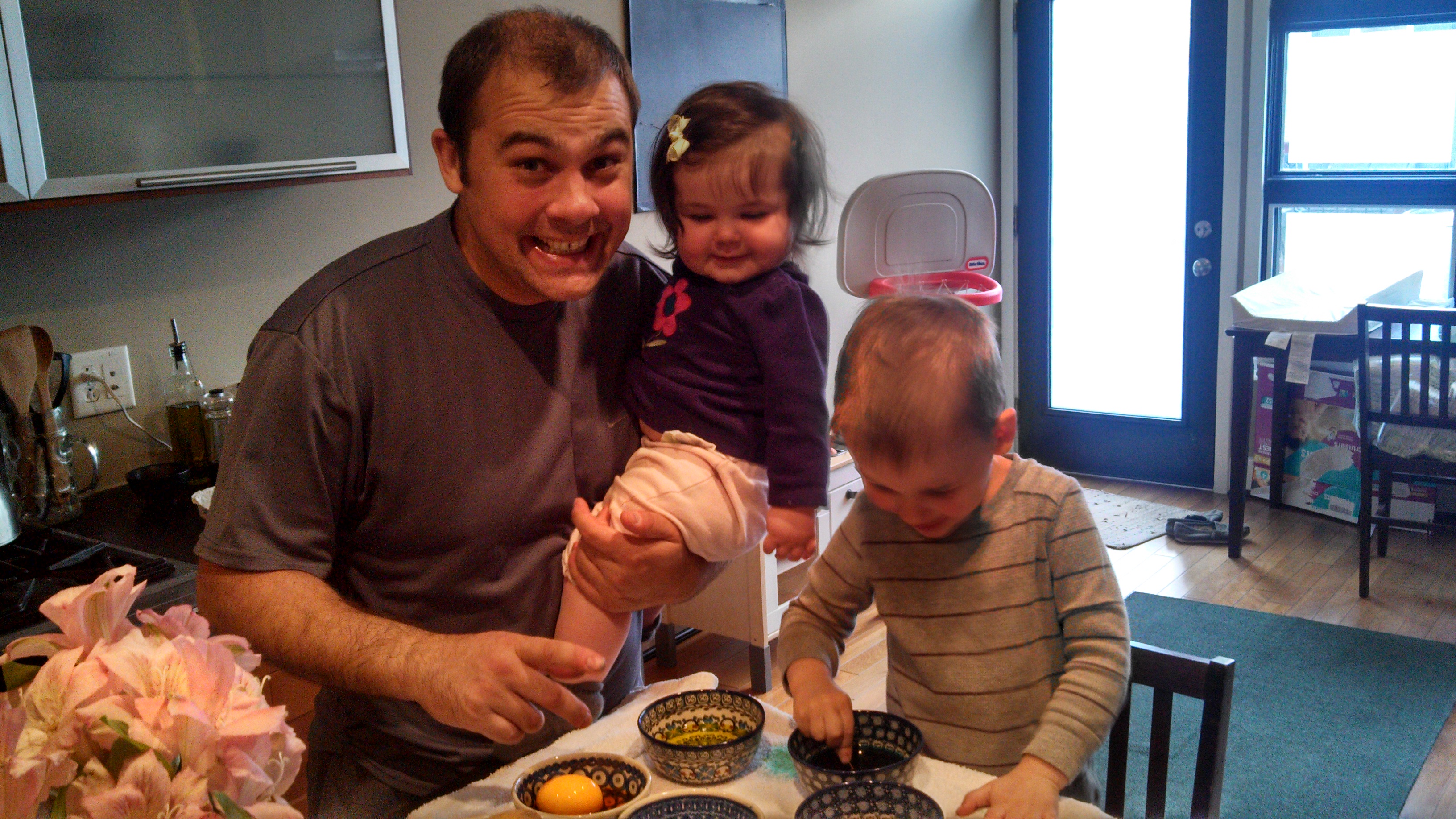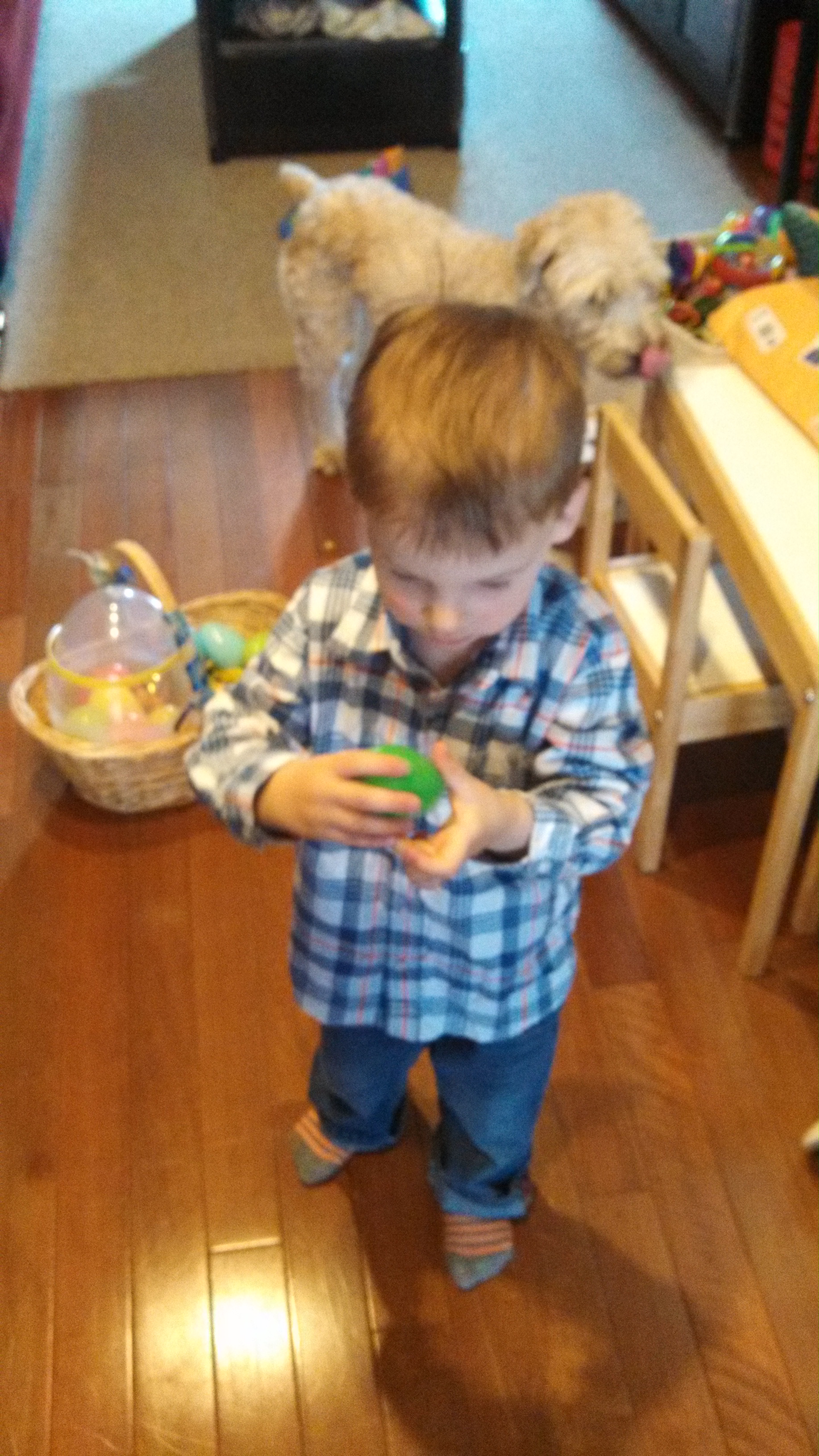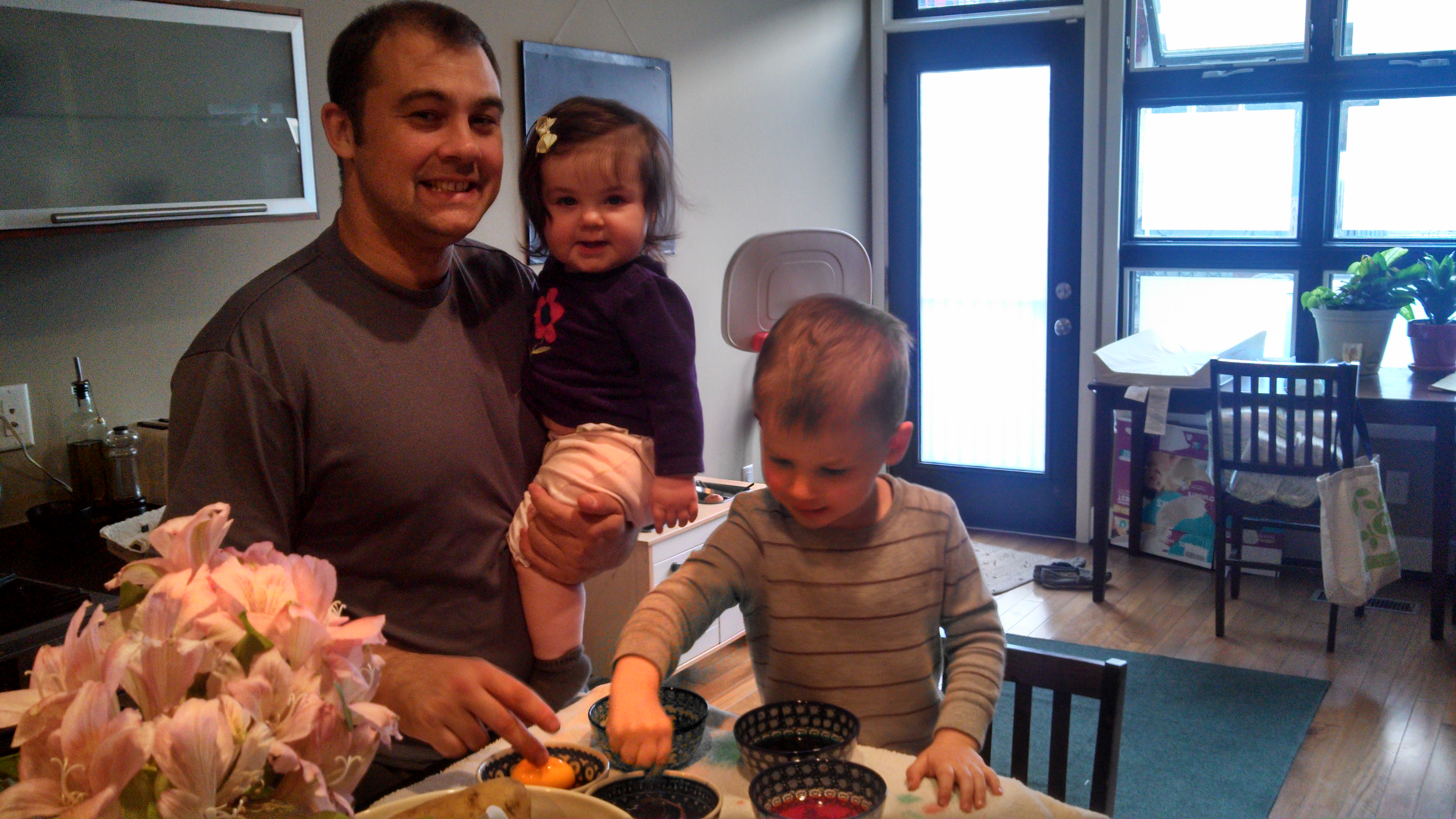 On Easter morning we walked up to a local church. I wanted to walk around before Mass to show Wil some of the things in a church, but it was still locked at 9:30 before a 10am mass! The kids were getting very restless, so we headed home to open easter baskets and put stickers on the colored eggs.