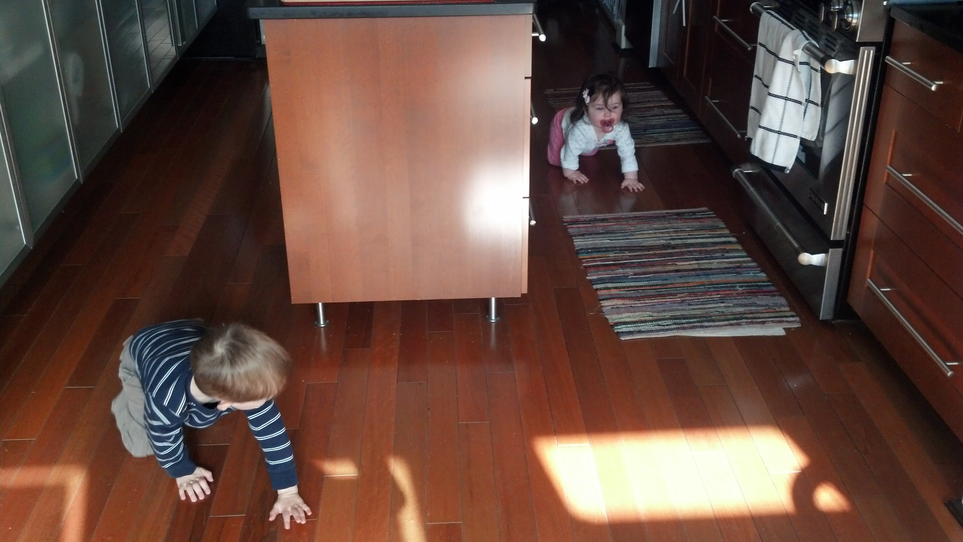 It is a big event when daddy gets home. Wil use to just run to the door and wait – but now Evie can crawl after him. Wil has caught on and now waits for Evie and shows her the way, via crawling.