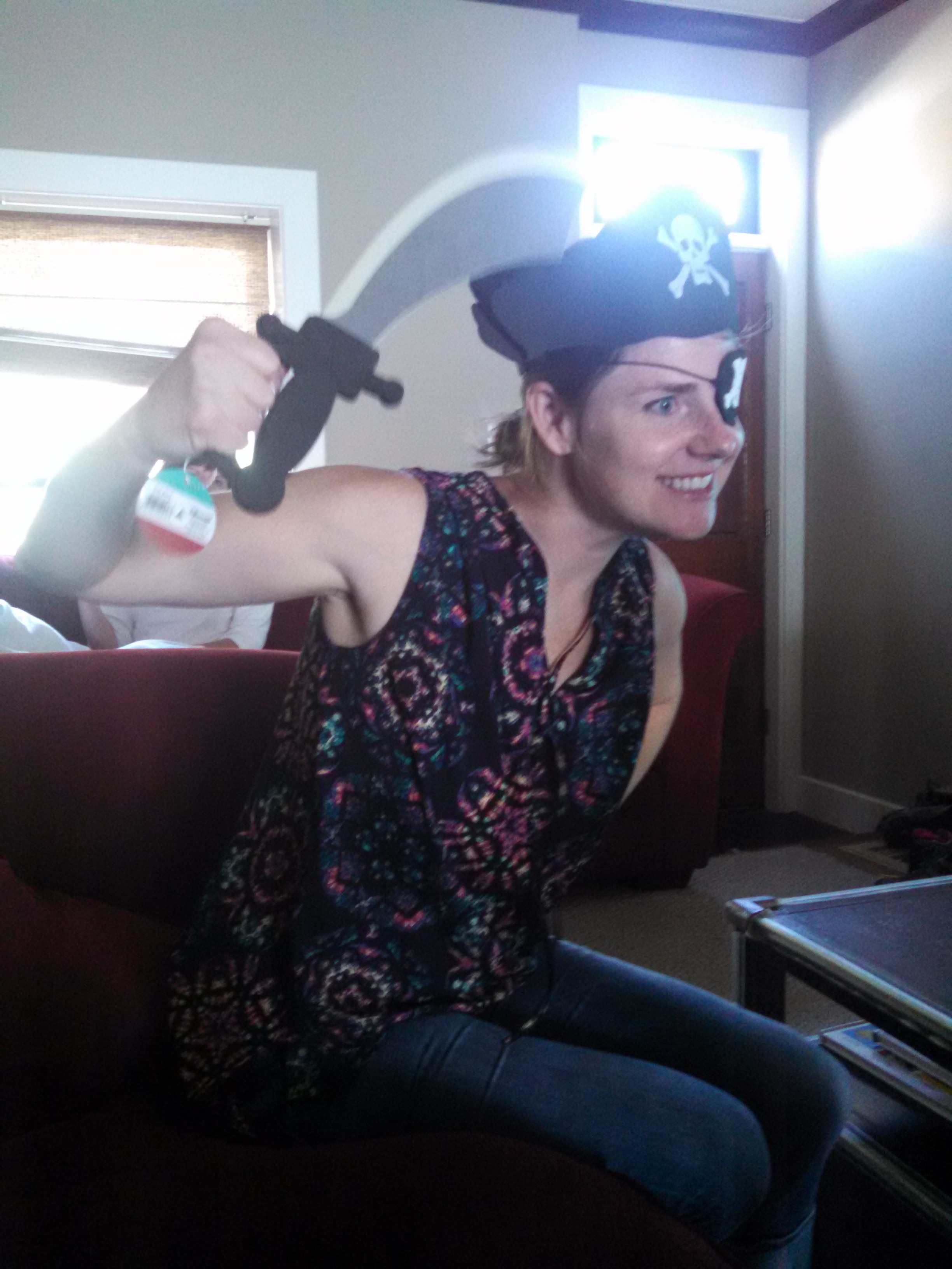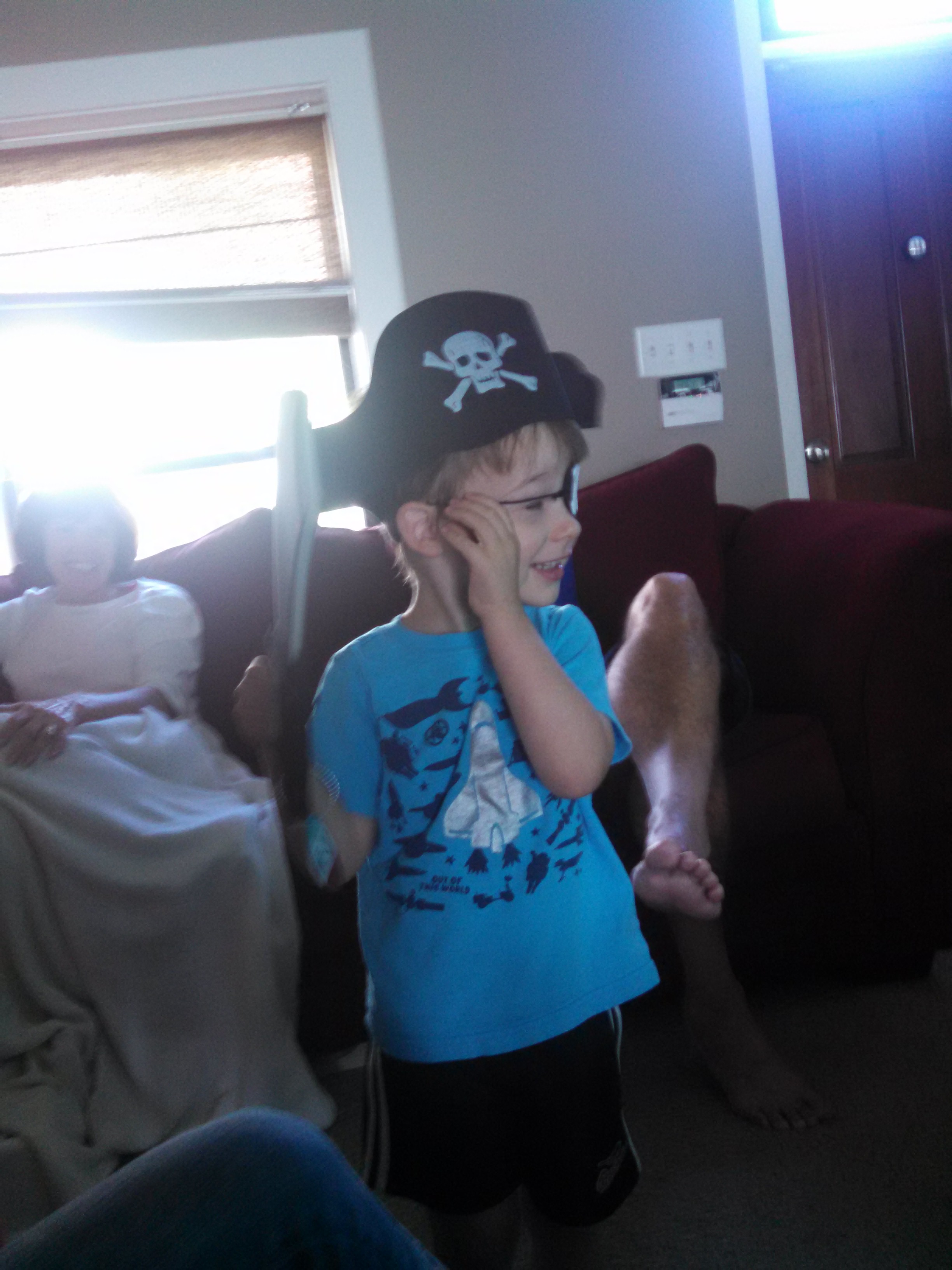 Here we are hanging out at home, Mimi brought pirate dress-up: