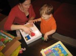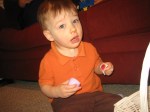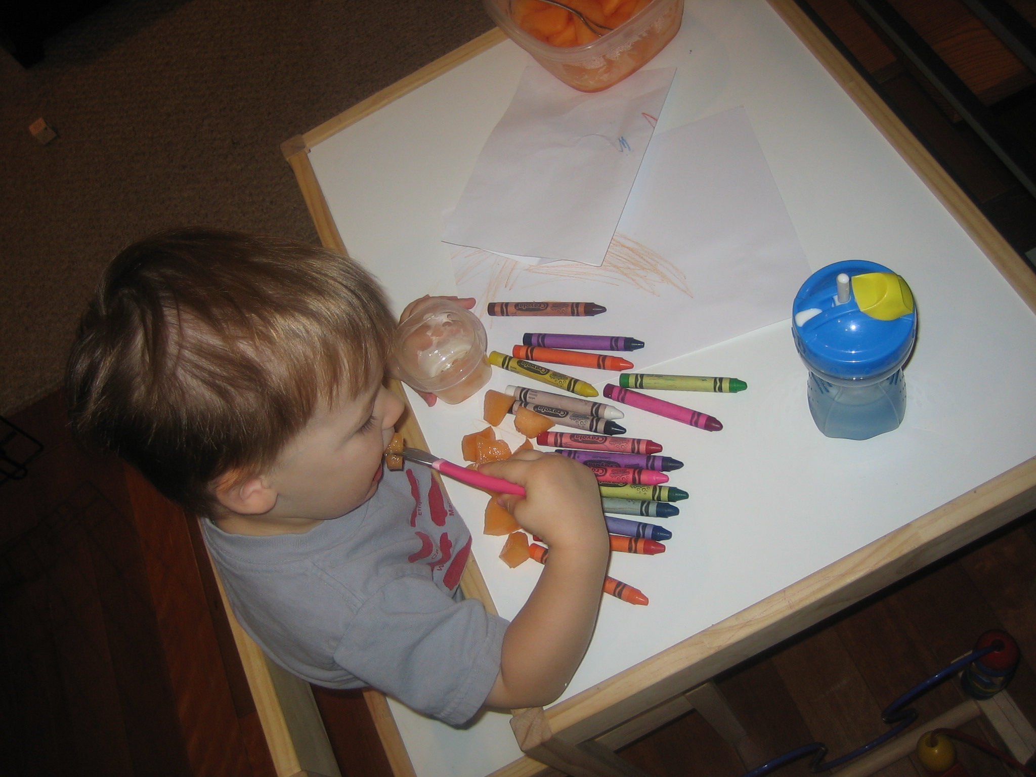 9:00 – TV off. Wil and I color, listen to some Raffi, have a diaper change, sit on the potty, feed Barney, watch the street cleaners go by. Evie continue to fuss, so I change her and give the rest of the bottle. While I feed Evie, Wil always wants to sit right next to me. Today, he played with the lights and found a block in the couch cushions which kept him busy for awhile (score!). Overall, its a successful feeding considering there was no Mickey). I take Evie upstairs to nap.