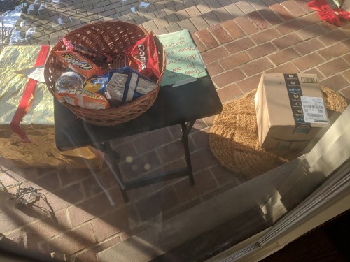 2:20pm — Went and got Zev. Evie and Zev have gummies on the couch and watch a show while I run down to take barney out. Do a Zev diaper and take out the trash. We get a package and they take some of our snacks! I got this idea from Celia last year and its been a huge hit: